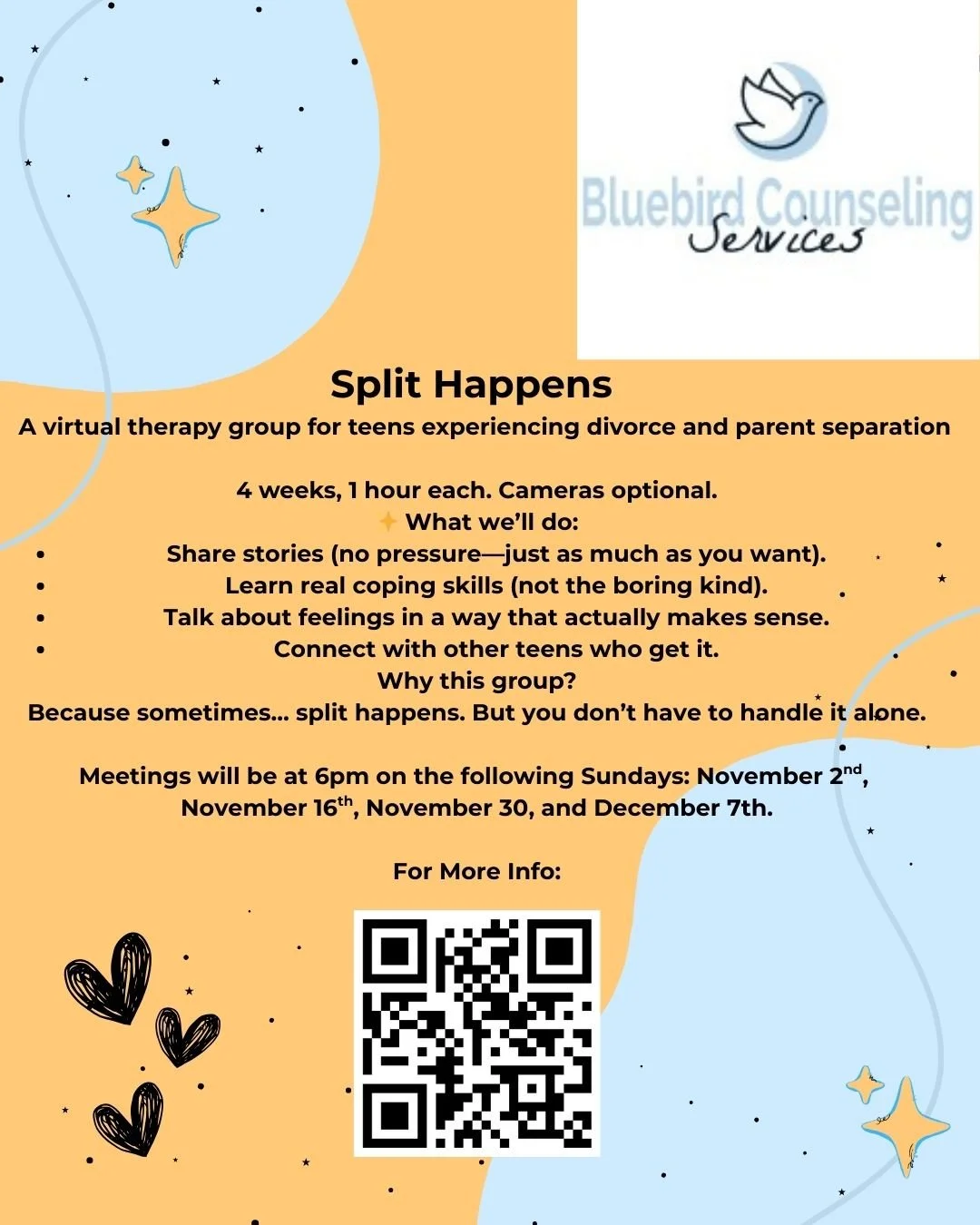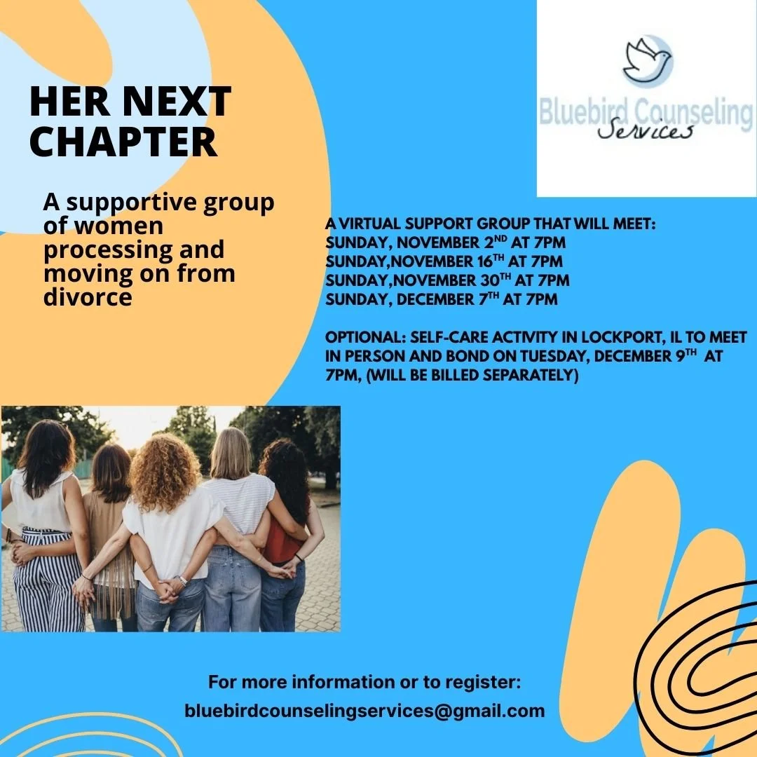 Bluebird Counseling’s virtual group therapy offers a supportive, confidential space to connect with others who share similar experiences. Guided by compassionate, skilled therapists, our groups help members build insight, learn coping skills, and experience healing through shared understanding.